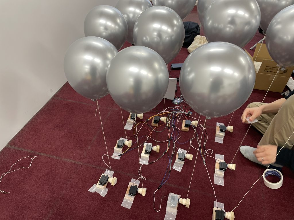 今回の制作では、かなり反省点が多かったと思います。最初の制作物を決め、それに従って制作を進めていくという点ではスムーズに行うことができたと思いますが、部材選定や発表するうえでの作品の位置づけといった点に時間を取られ、最終的な成果物のクオリティも下がってしまったなと感じています。実際に成果発表の際、全ての風船を上に上げようとすると、検証では見られなかった意図しない挙動をしてしまい、全体のクオリティの低さが目立ってしまったなと感じています。