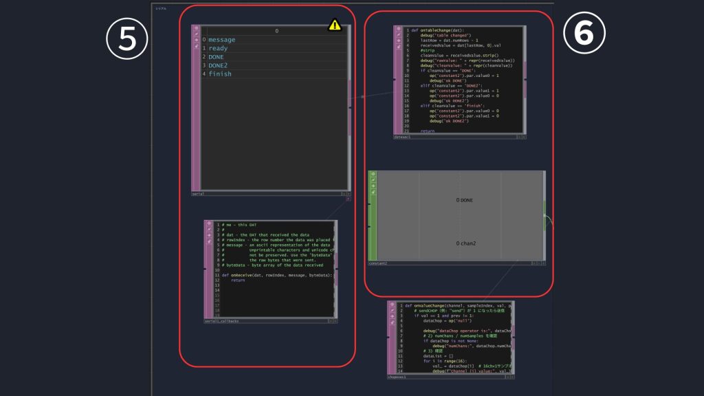 ⑤ではArduinoから受け取ったシリアルを表示し、1と0を返すCHOPを制作しています。この値により、風船の移動が終わり全て初期位置に戻ると③で述べたようにUIの座標もリセットされます。